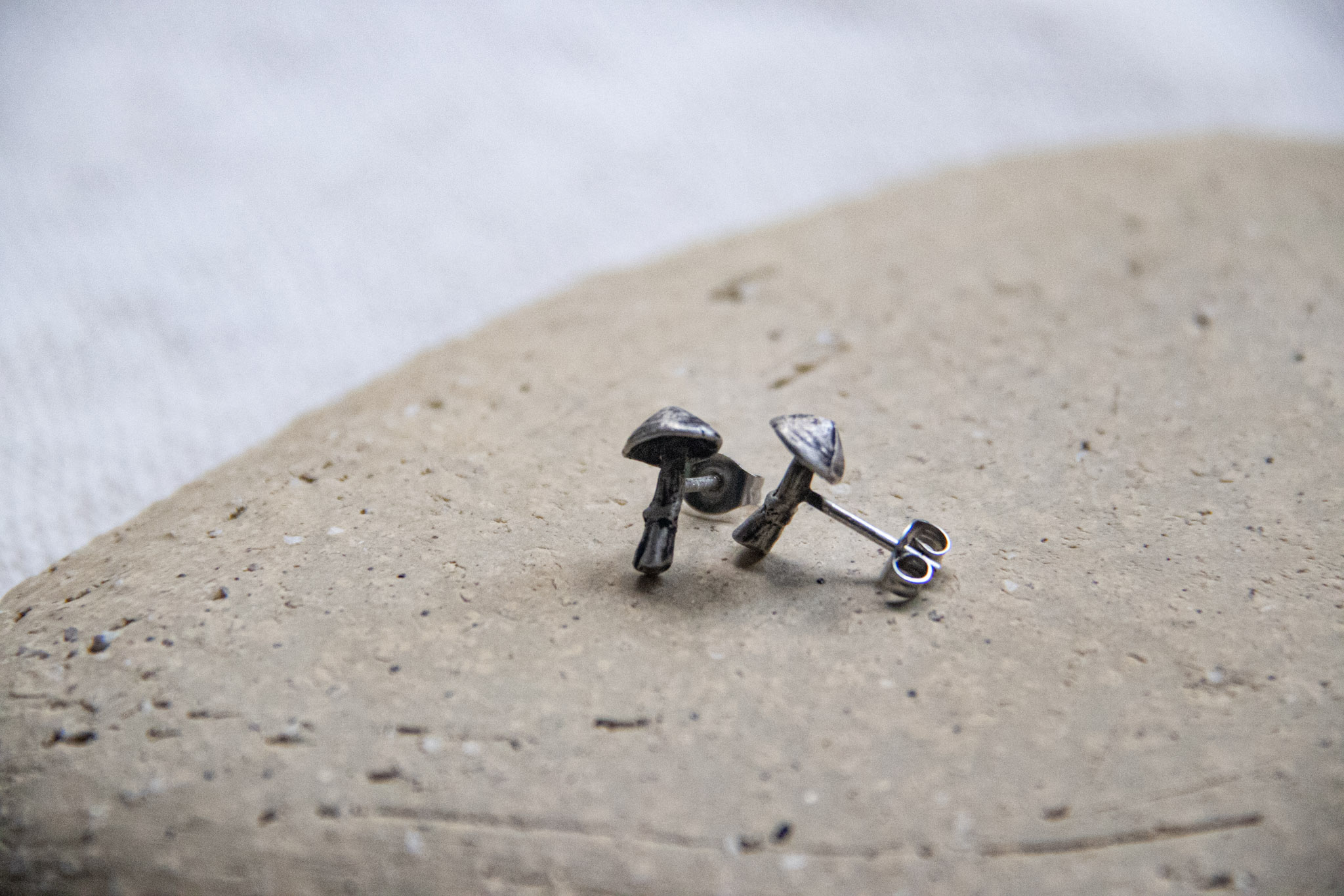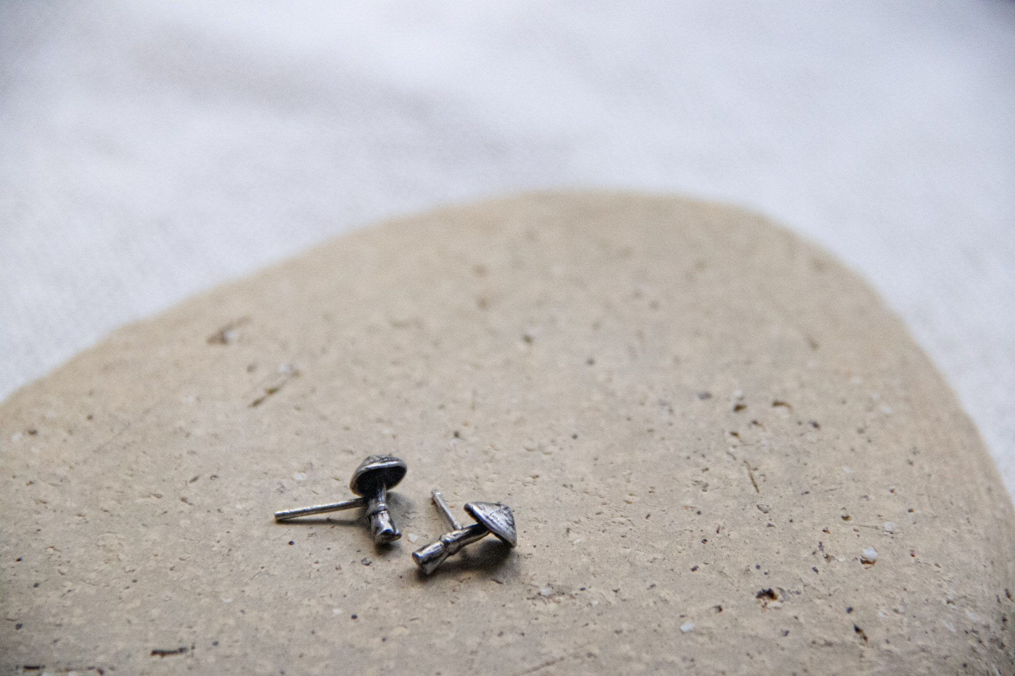 Aretes de plata con forma de honguitos. Hechos manualmente con un peso de 2 gramos y 1 cm de largo.